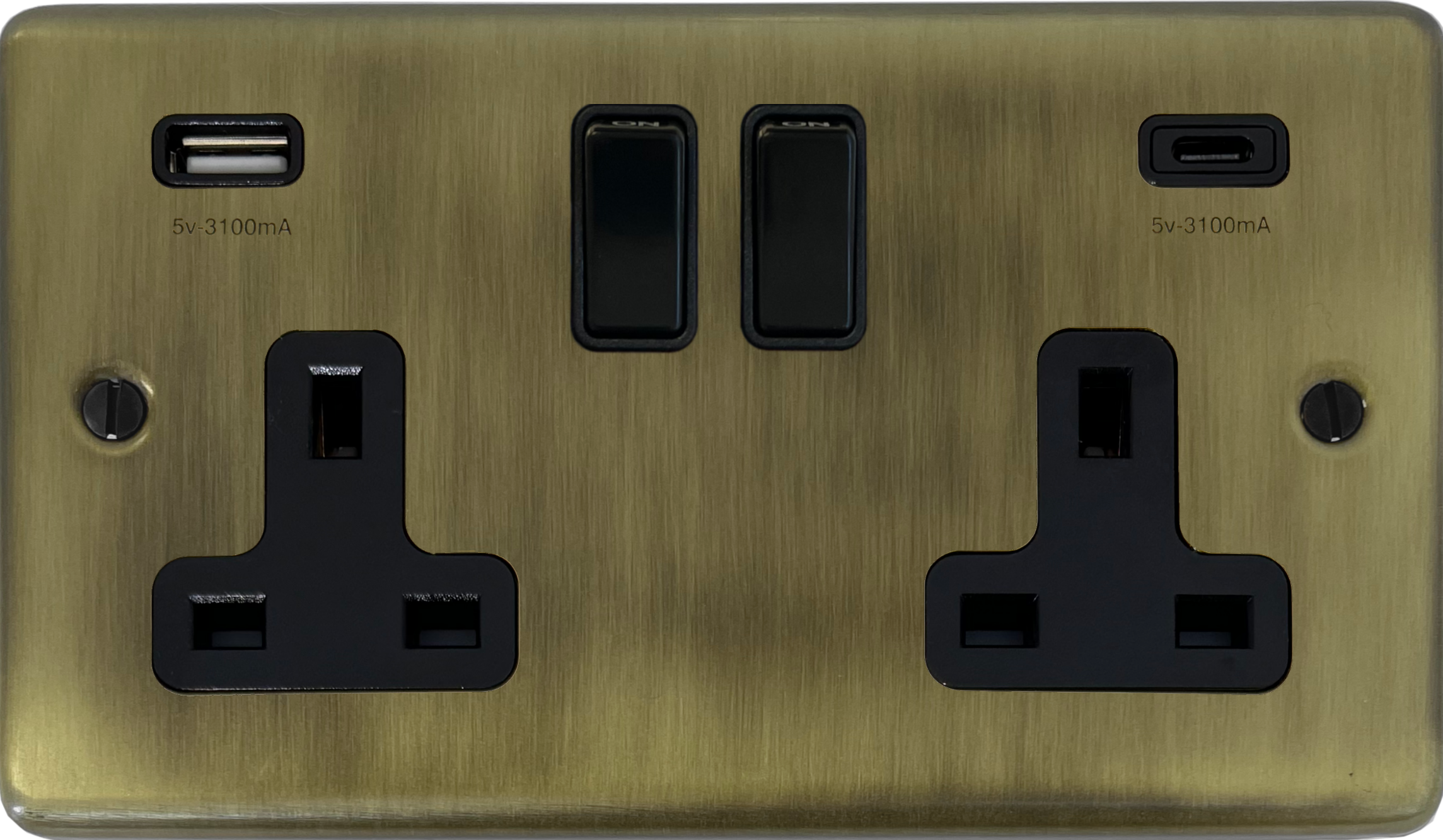 Contour Light Antique Brass Socket with USB (2 Gang/USB-A and USB-C/Black Switches)