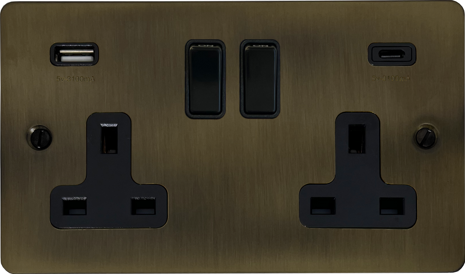 Flat Antique Brass Socket with USB (USB-A and USB-C/Black Switches)