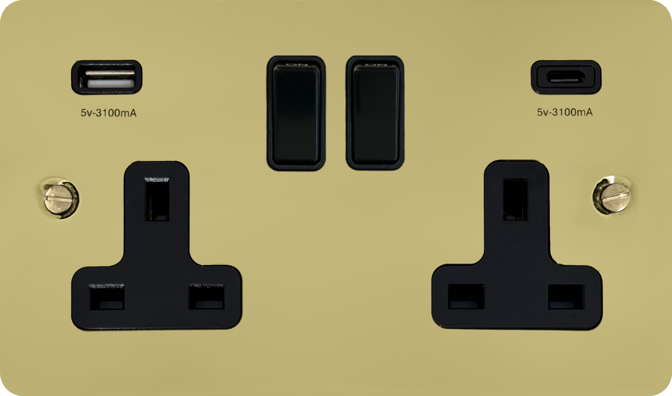 Flat Polished Brass Double Socket with USB (USB-A and USB-C/Black Switches)