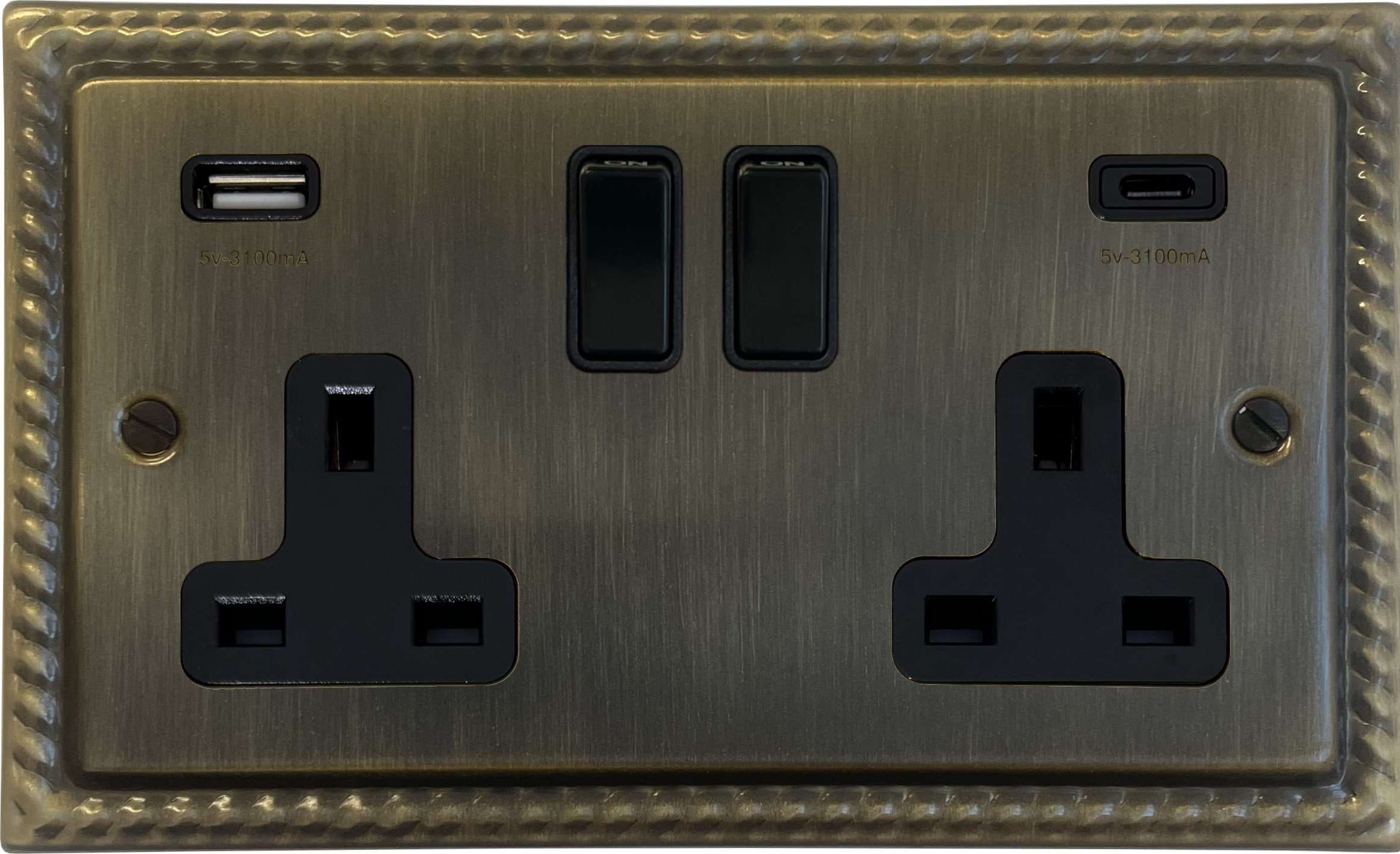 Georgian Antique Brass Socket with USB (2 Gang/USB-A and USB-C/Black Switches)