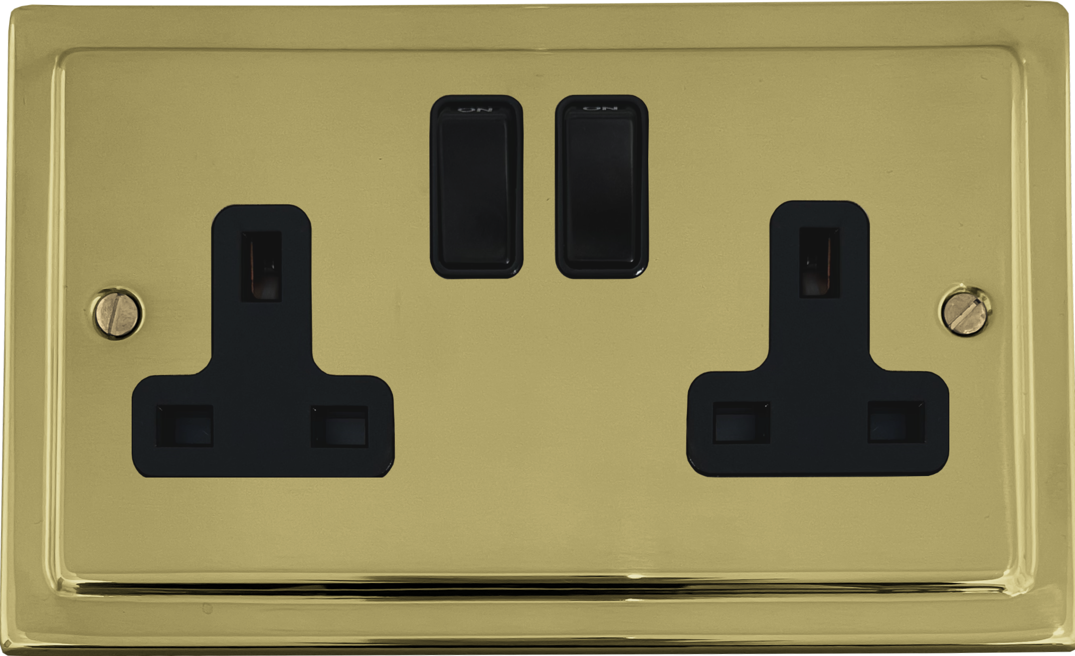 This is a 2 gang 13 amp switched socket with black inserts and black switches on a Victorian polished brass plate.